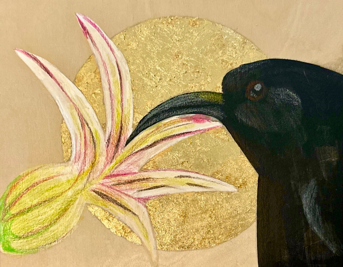Acrylic paints and ink on wood with goldleaf