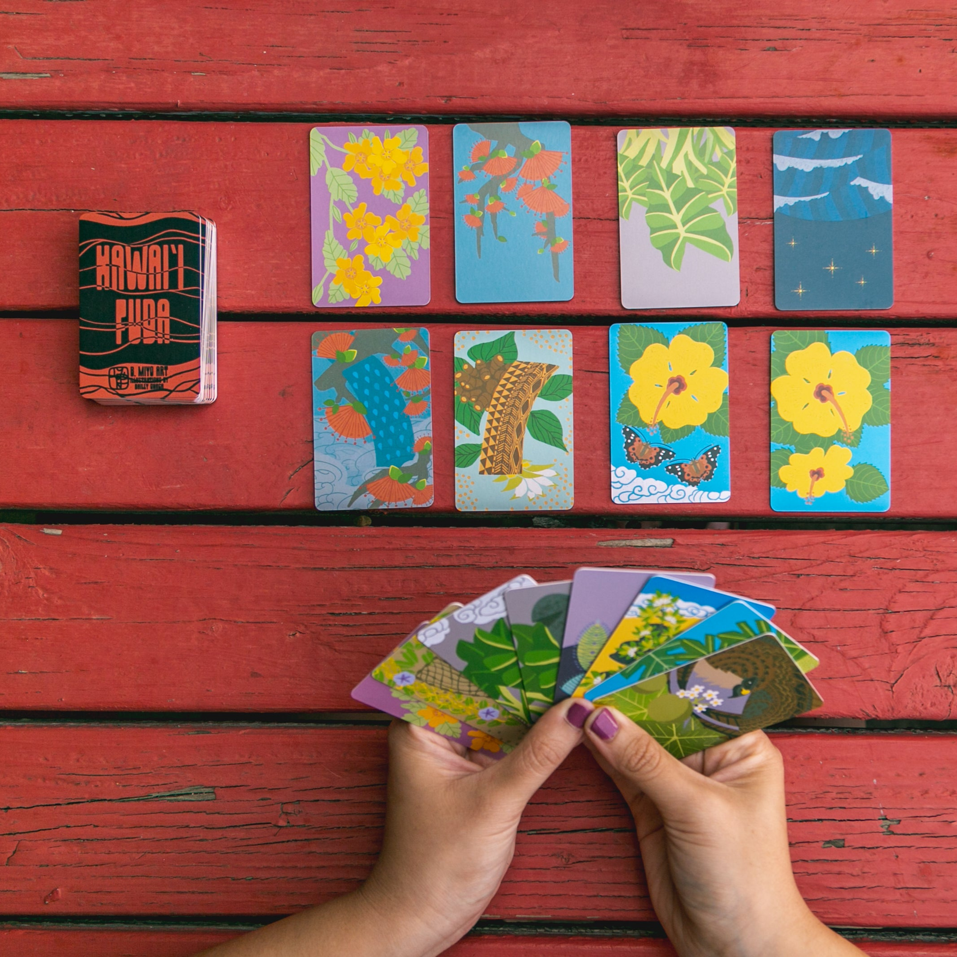 All original artwork by Bailey Onaga. Based on the popular Japanese flower card game known as “Hanafuda.” I replaced the Japanese elements with native, endemic, and Polynesian-introduced species and other natural elements found in Hawaiʻi. The simple rules and beautiful artwork of this game has and will continue to bring generations together.