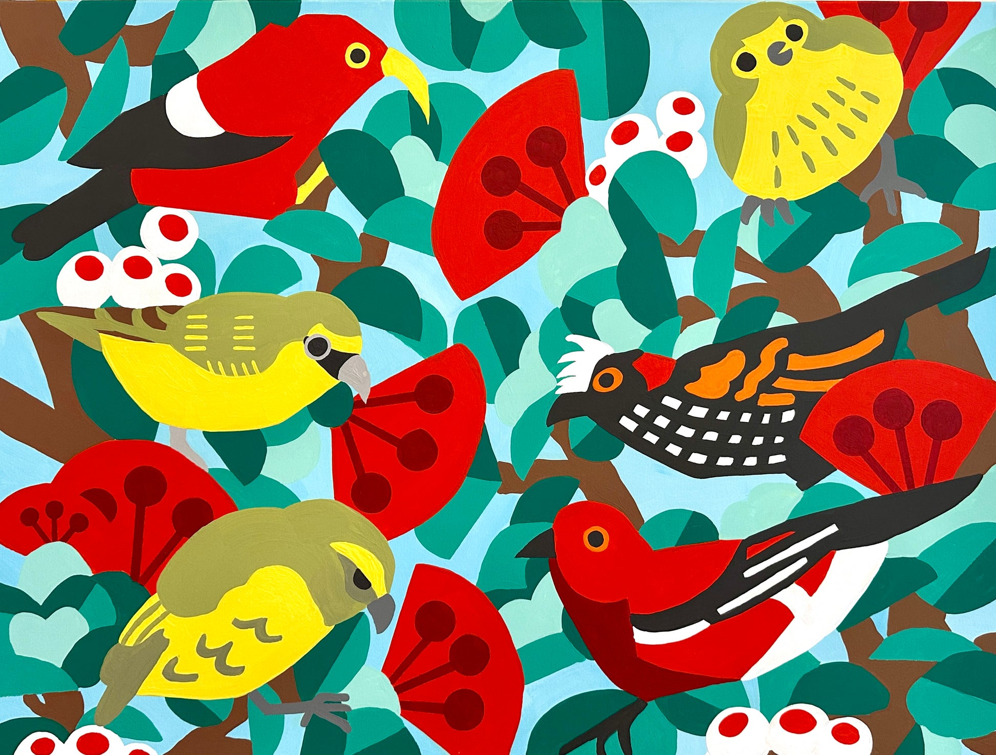 Kiwikiu, ʻAkohekohe, ʻAlauahio, ʻI’iwi, ʻAmakihi, and ʻApapane with ʻŌhiʻa Lehua to commemorate 2024 Makahiki O Na Manu Nahele - Year of the Forest Bird