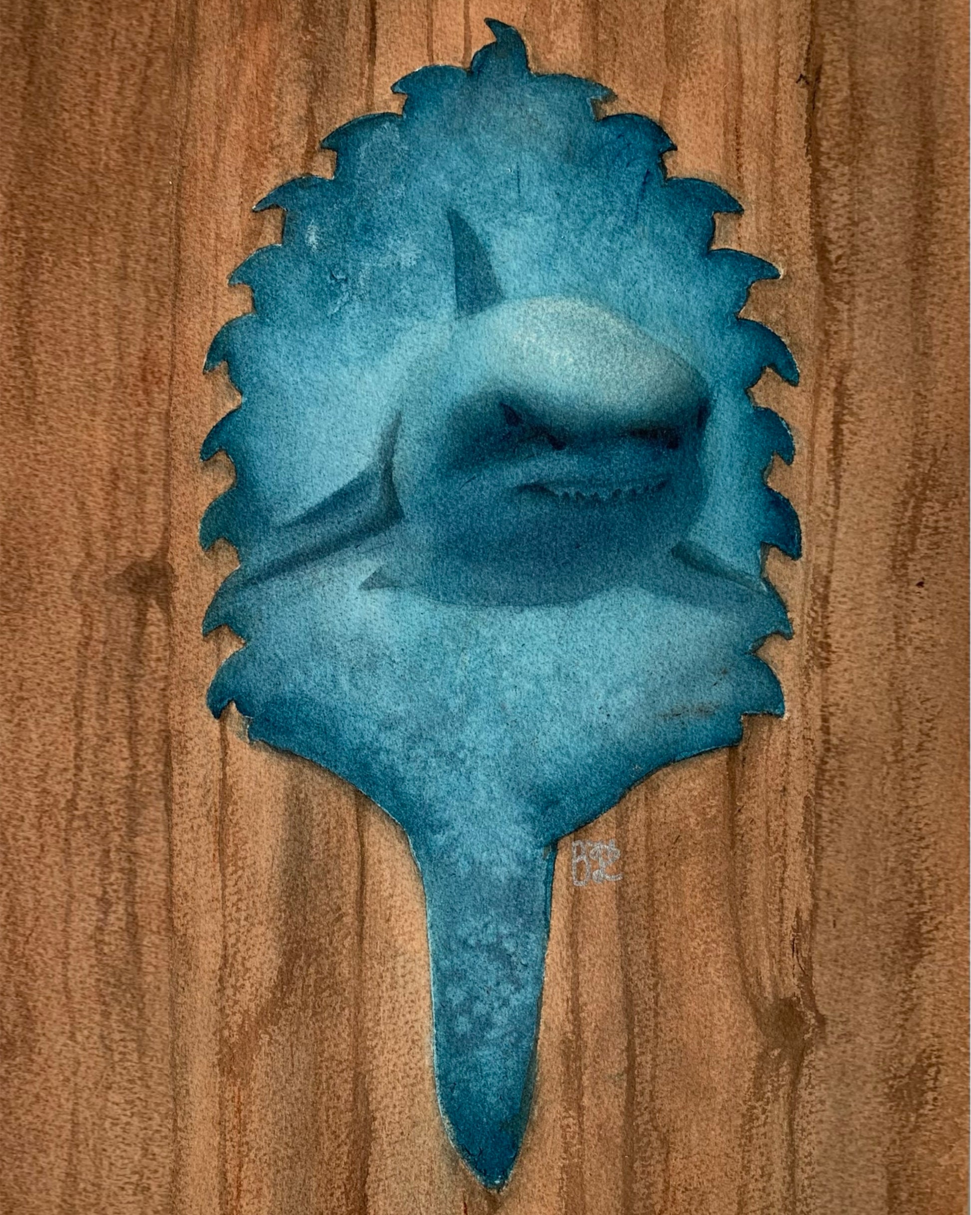 This piece features a silhouette of a shark tooth dagger. The blade was crafted with teeth of a mano, or shark, and wood. Sharks are vital in Native Hawaiian culture as they are considered ʻaumakua, or family guardians.