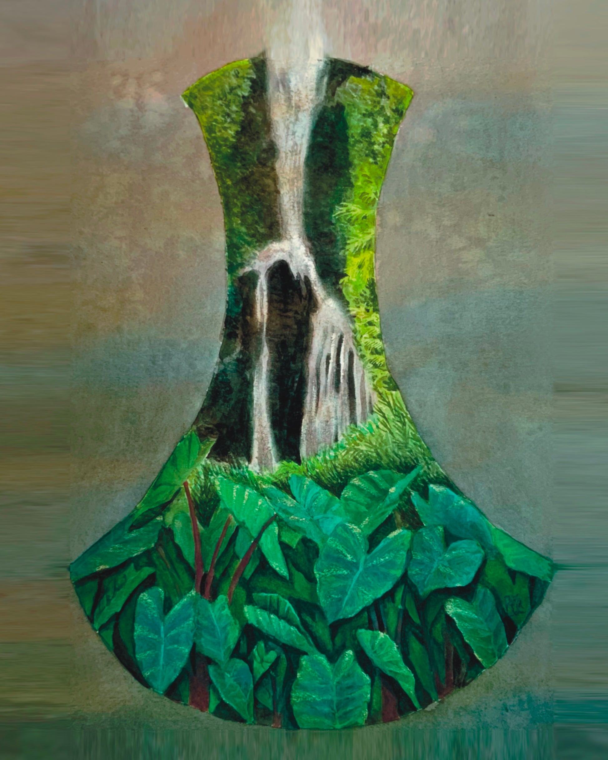 Watercolors with Hawaiian salt Printed on high quality linen texture paper by Wailuku based Maui Printworks. First piece from a series of shapes found prominently in Hawaiian culture. This piece features Kalo (taro) and a waterfall within a poi pounder silhouette. Photos by Aki Sword