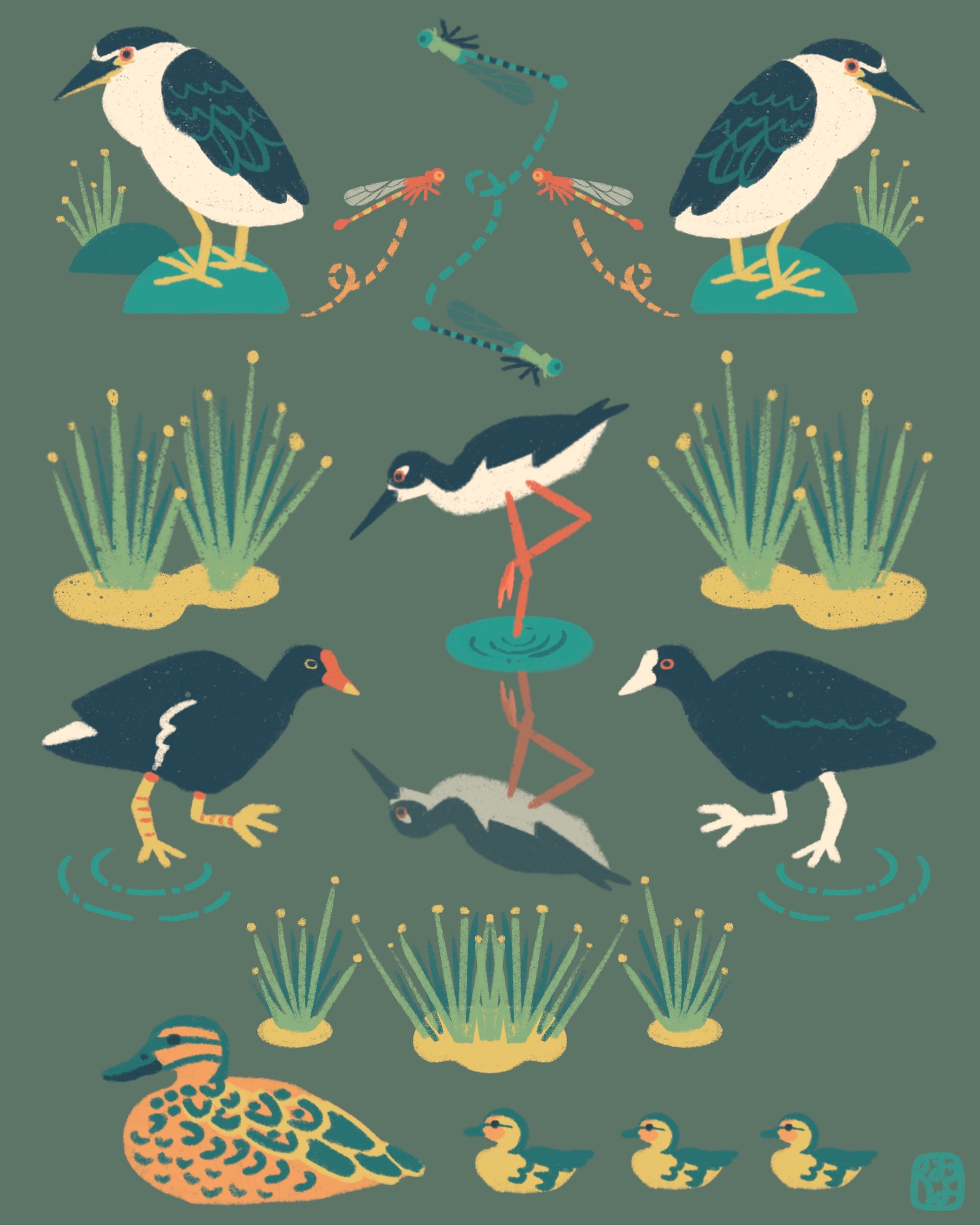 Featuring āeʻo (Hawaiian Stilt), ʻAlae Keʻo Keʻo & ʻAlae ʻUla (Hawaiian Moorhen), Makaloa sedge, Koloa Maoli (Hawaiian Duck) and her ducklings, ʻAukuʻu (Heron), Pinao (Dragonfly) and Pinao ʻUla (Damselfly)